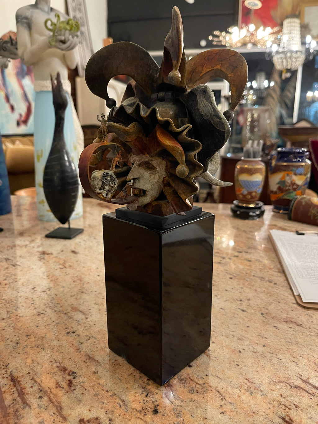 Theodore Gall, is an American sculptor born in 1941 and attended the Art Institute of Chicago and the American Academy of Art. What began for him in the early nineties as a series of fantasy hats has evolved into an extensive selection of heads with a var